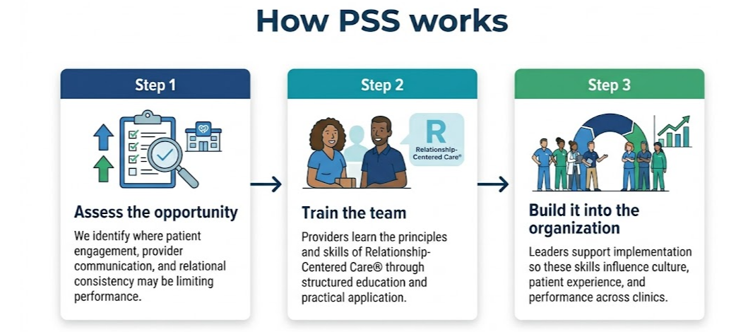 PSS equips providers and organizations with the relational skills, communication tools, and implementation structure needed to create stronger therapeutic relationships and more consistent patient engagement.